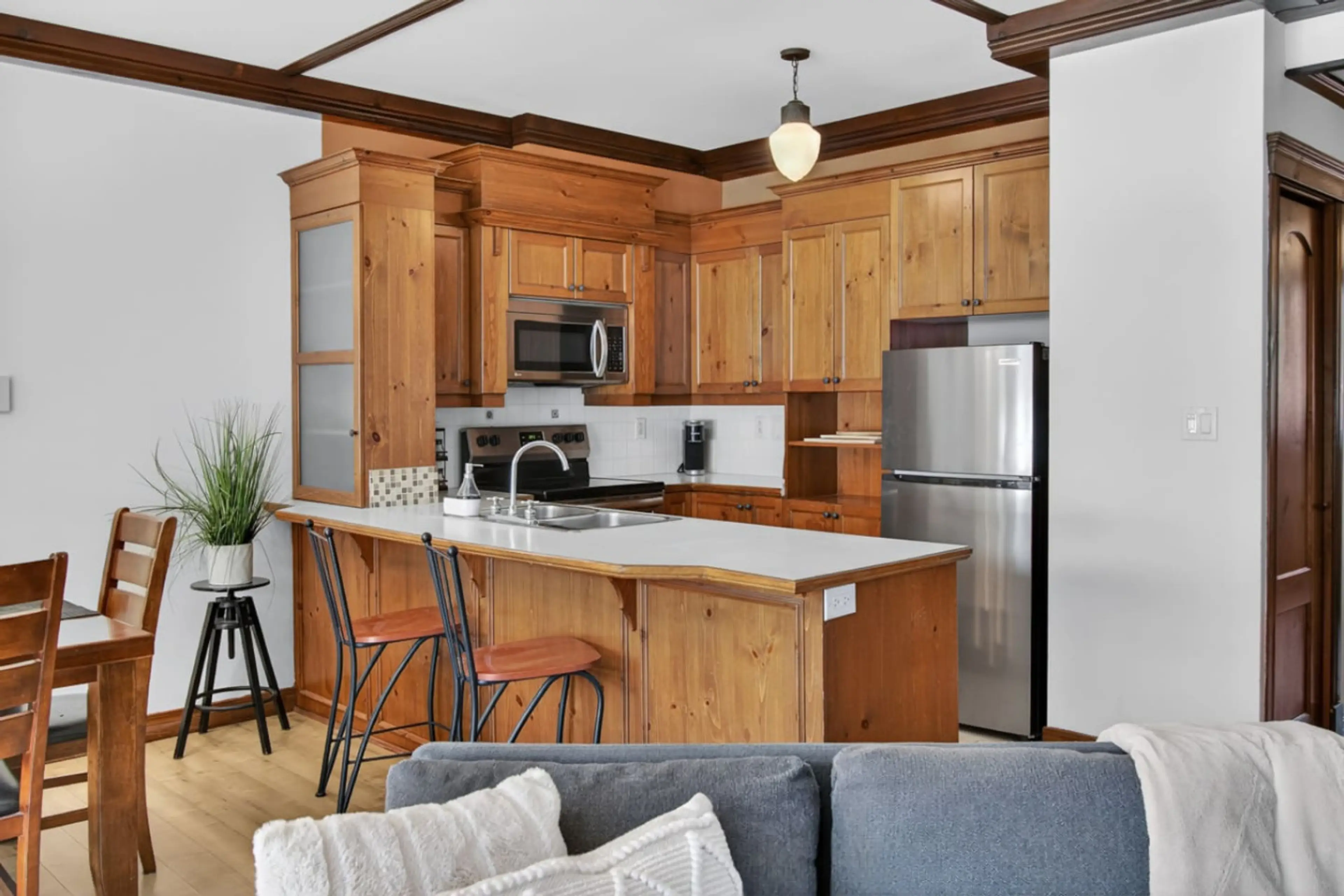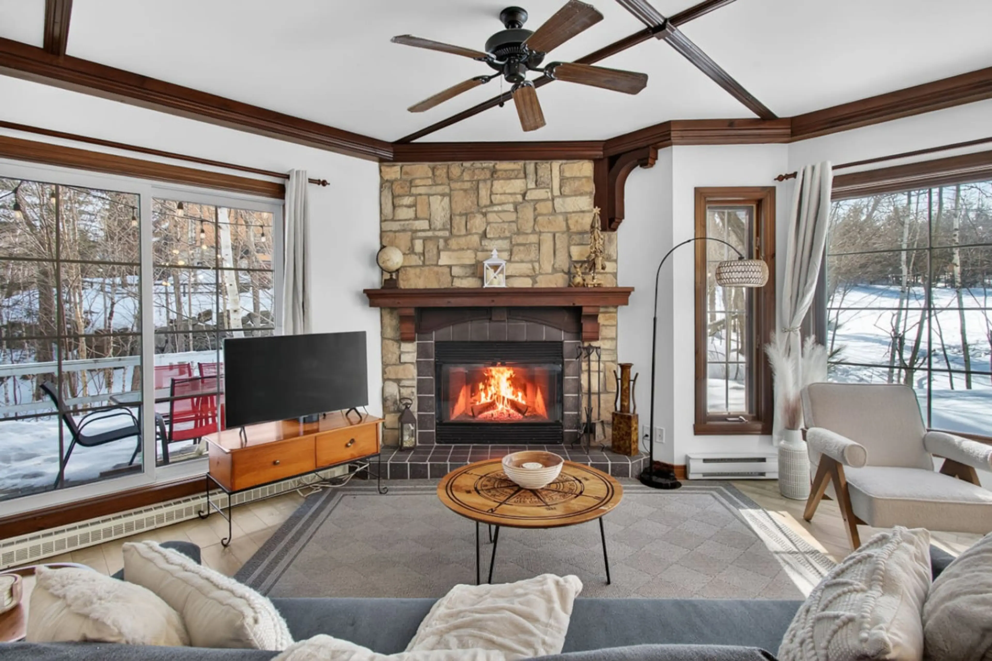 Welcome to Tremblant Les Manoirs! This bright, open-concept 2-bed, 2-bath retreat features expansive windows with stunning mountain and Le Géant golf views. Relax by the wood-burning fireplace or on your private covered patio. Enjoy the seasonal pool, hot tub, and easy village access via the free sh...